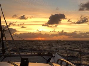 Our day started at 4am!! Leaving Bitter End off to St Maarten. Very weird to be heading off in the dark spotting channel markers, islands and other boats to get us safely out into open waters. The temperature was gorgeous even at 4am. The absolute highlight today was seeing the sunrise – breathtaking and to think family and friends farewelled that same sun that we welcomed – Mother Nature at her glorious best.